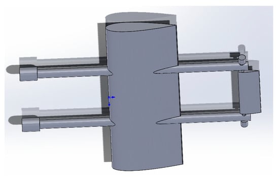 Initially, the design parameters are set as follows: the mainsail chord length (C1) is 400 mm, the wingspan (B1) is 1600 mm, the tail chord length (C2) is 120 mm, the wingspan (B2) is 550 mm, the distance between the tail and the aerodynamic center of the mainsail (L) is 600 mm, and the upper and lower position (H) of the tail is 800 mm. The model is constructed in SolidWorks based on these parameters, as shown in Figure 4.