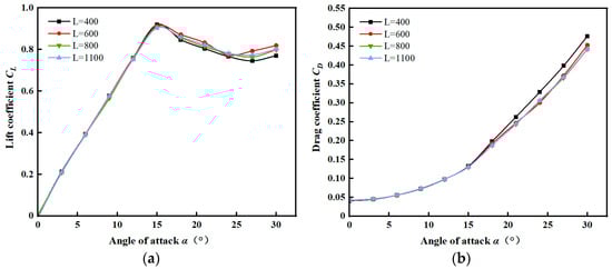The mainsail is the primary power source for an unmanned sailboat [24]. With an aspect ratio (AR) of 4, a taper ratio (τ) of 1, and a vertical distance (H) of 800 mm between the upper and lower tail positions, other parameters are as specified in Table 2. The vertical distance (L) of the tail sail from the mainsail is varied at 400 mm, 600 mm, 800 mm, and 1100 mm to investigate the aerodynamic properties of the mainsail at different distances. The lift and drag coefficients at different distances, as obtained through Fluent simulations, are shown in Figure 7.
