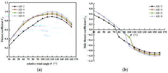 Thrust coefficient curve and side thrust coefficient curve: (a) thrust coefficient; (b) side thrust coefficient.