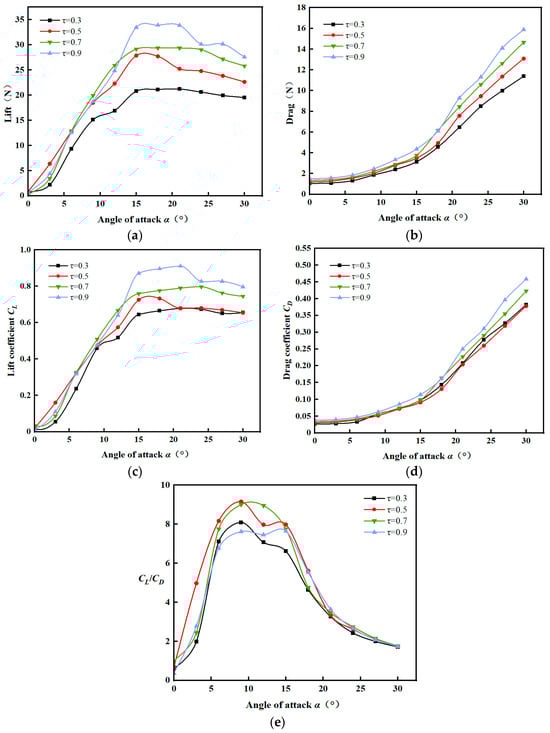 Lift resistance characteristic curves at different taper ratios: (a) lift; (b) drag; (c) lift coefficient; (d) drag coefficient; (e) lift–drag ratio.