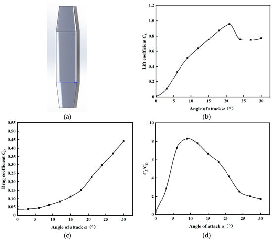 Lift and drag characteristic curves with different aspect ratios: (a) lift; (b) drag; (c) lift coefficient; (d) drag coefficient; (e) lift–drag ratio.