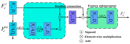 where is the modulation feature between the first encoder layer and the decoder layer. represents a shared MLP and Sigmoid function operation. Inverse attention can capture multi-scale information and maintain low-level details via residual connections. To further weaken the influence of spatial indistinguishability, the Feature Enhancement (FE) unit is used to operate on the intermediate feature. This module is implemented using a simple shared MLP. Finally, the modulated encoder feature is fused with the decoder feature.