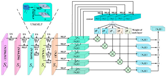 To integrate information and find a useful context for semantic segmentation, the complete-size feature map is adaptively fused at the point level. An MLP is used to summarize point-level information among the upsampling process of each complete-size feature map: