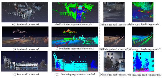 In order to better display the visual segmentation results, details of Figure 4b,f are magnified in Figure 4d and Figure 4h respectively. From Figure 4d,h, it can be seen that RAAFNet achieves precise segmentation of scanning artifacts, railings (man-made structures), and nearby cars in the scene model. The prediction results of Scene3 in Figure 4j demonstrate significant segmentation performance for buildings and tall vegetation. Moreover, from the magnified prediction result image in Figure 4l, it can be observed that the segmentation boundaries of different categories are clear in the segmentation of low vegetation, man-made structures, and natural landscapes, indicating a satisfactory visual effect.
