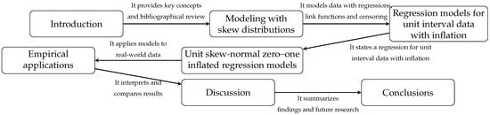 The remainder of this article is structured as follows, as illustrated in Figure 1. Section 2 provides background on skew models, focusing on the SN distribution and extensions to handle inflated data. In Section 3, we present regressions for data in the unit interval with inflation, detailing the complementary log–log SN, probit SN, and logit doubly censored models, along with their information matrices. In Section 4, the new SNZOI regression model is introduced, including its formulation, parameter estimation, and its particular case based on the probit structure. In Section 5, we demonstrate the application of these models through empirical case studies on doubly censored data and data inflated at one. Section 6 states a discussion of the key findings, comparisons with previous studies, limitations, and future research directions. The article concludes with Section 7.