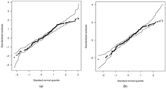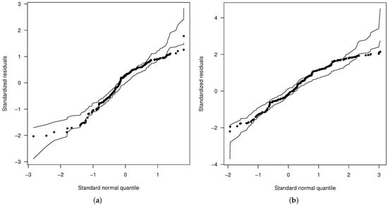 From the logit unit SN regression, the logit normal case is obtained with . The parameter estimates of the SN regression model for the response in the unit interval with logit link function can be obtained using the ML method. The corresponding log-likelihood function for a sample of n observations is obtained similarly from the PDF defined in (4), where , , and are given in (5) with being stated in (12). The elements of the score function for and are similar to those of the complementary log–log unit SN model, but with being formulated in (12), while for the parameter , we have that