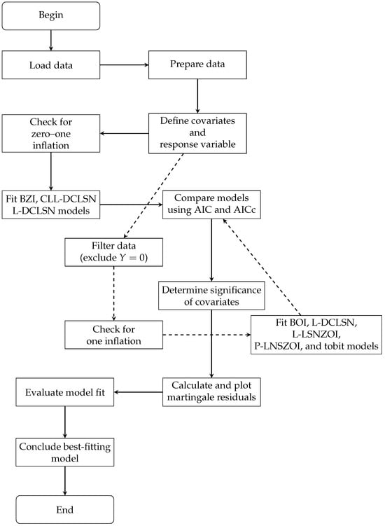 This case study focuses on analyzing clinical data to model the proportion of damaged incisor teeth among an individual cohort. The data are characterized by a high inflation at the value , indicating full damage, which necessitates the use of specialized models to handle this inflation. We want to identify significant covariates that influence the proportion of damage on incisor teeth. To illustrate the process for Case Study 2, we present Algorithm 2 and the flowchart in Figure 4. This variable exhibits significant inflation at , with 65 cases of complete damage and only one case of no damage (). For this analysis, we exclude the observation where , resulting in a dataset of 289 one-inflated observations with .