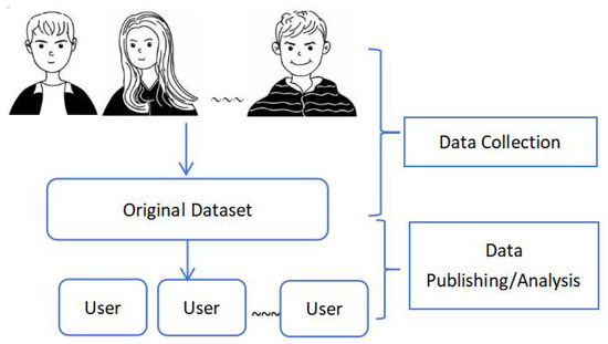 The rapid collection of digital information has led to a proliferation of datasets over the past two decades, and the rate of collection has become even more rapid in recent years. Data managers are responsible for releasing data for further analysis. Figure 1 depicts the two phases of data collection and data release/analysis. In the data collection phase, individuals submit personal information to form datasets that contain sensitive information, and data managers have full control over the datasets. In the data release/analysis phase, the aim is to share the dataset or query results with the public, providing data models and specific machine learning or data mining algorithms [1]. Data release and analysis bring social benefits such as providing quality services, publishing official statistics, and supporting data mining or machine learning tasks. However, the importance of data privacy protection comes to the fore. If data managers are not trustworthy, personal information may be leaked directly during the data collection phase. Even if the data manager is trustworthy and adopts anonymization techniques, when releasing aggregated information to the public, personal information may still be at risk of leakage due to the untrustworthy nature of the general public. Therefore, privacy protection is a vital issue.