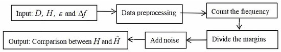 Differential privacy margin histogram publishing process. where D is the original dataset, is the original marginal histogram, where denotes the number of frequencies in each bracket of the histogram, and is the marginal histogram after adding noise.