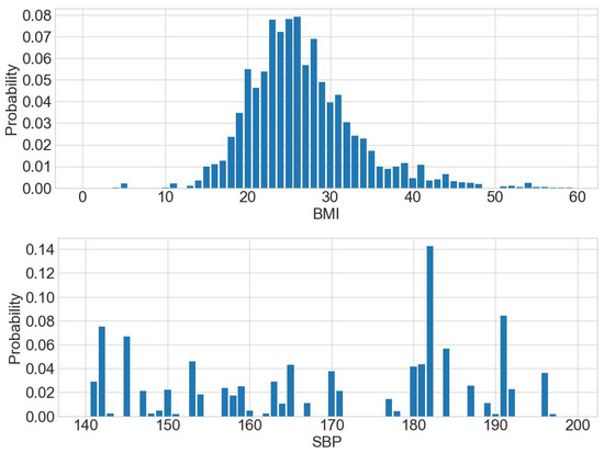 Fourthly, the composite representation as a probability distribution function that can be used to estimate the potential distribution of the original data is considered and then sampled based on this probability distribution to obtain a composite dataset. Comparing Figure 5 and Figure 6, the probability distribution of the BMI and SBP estimates is similar to the probability distribution function of the original dataset.