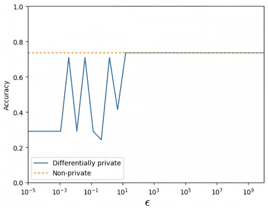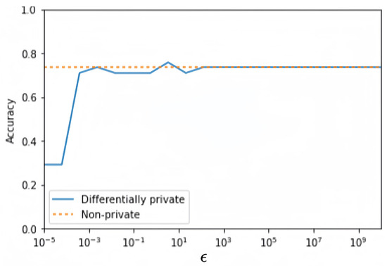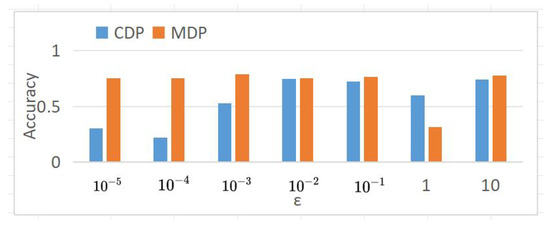 where TP, TN, FP, and FN represent the number of patient true positive examples, true negative examples, false positive examples, and false negative examples, respectively. The experimental results of CDP and MDP are shown in Figure 8 and Figure 9, where the values of are taken in the range of [, ] for 100 different points. The benchmark accuracy of the logistic regression model without privacy protection is about 0.7577.