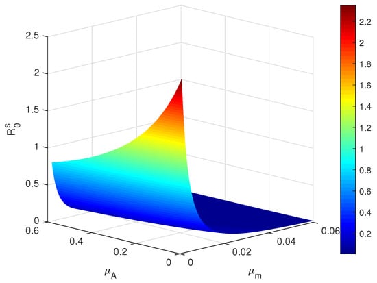 In the set , we investigate the dynamical behaviors of model (1). The following is the approach by which the basic reproduction number of model (1) can be obtained from [39,40]: