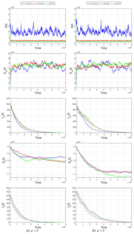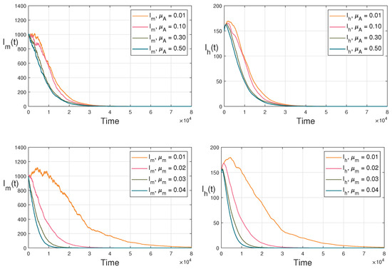 These simulation results show that the extinction occurs for a long period, which indicates that the population sizes of infective mosquitoes and infective human beings exponentially tend to zero as decreases on the left panel of Figure 4. Further, the parameter values are kept same, and if is taken as 0.5, is set as 0.1, then conditions of Theorem 4 are still valid with with , , , , , while the sign of changes as . The differences in the numerical simulations can be observed on the right side of Figure 4. The reduction in the maturity proportion of aquatic mosquitoes suppresses the number of infective human beings. But the effectiveness of this measure is limited as shown in Figure 4.