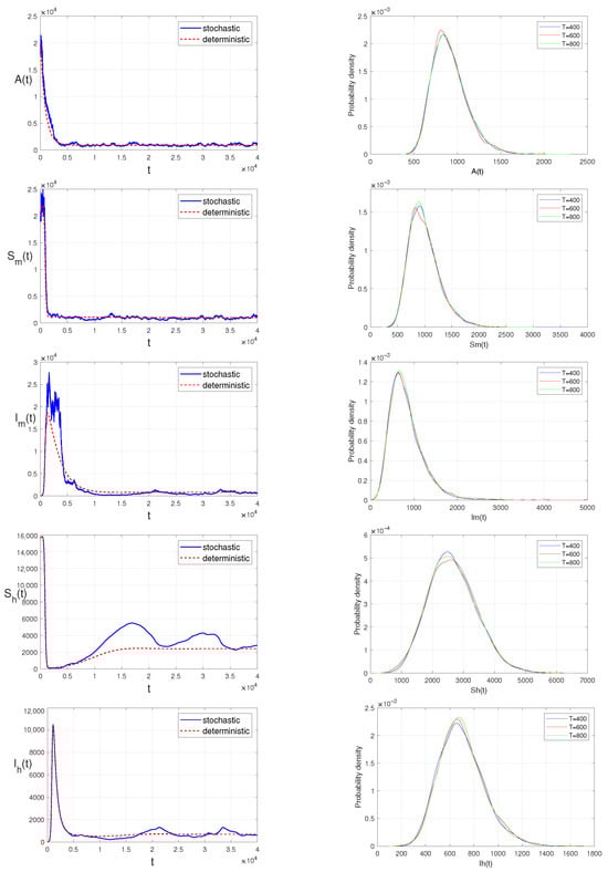 Because the condition is equivalent to , by Section 3.3, model (3) has a unique stationary distribution. In other words, model (3) is ergodic. Consequently, the persistence in the mean of infective mosquitoes and infective human beings is illustrated on the left panel of Figure 3, and the probability density functions of model (3) around the quasi-equilibrium point with , , , , are provided on the right side of Figure 3.