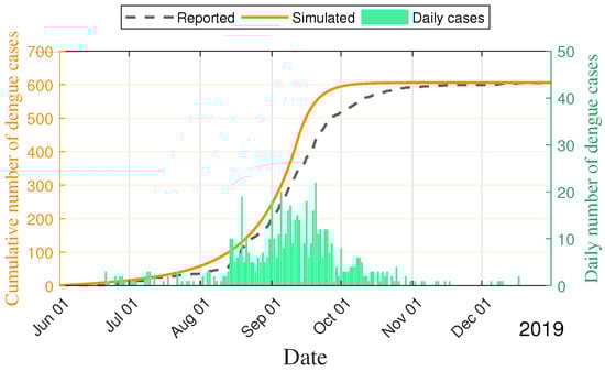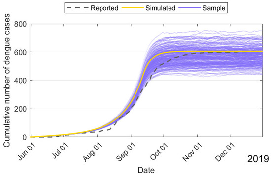 Further, the curves for the cumulative number and daily number of dengue cases are shown in Figure 5. The main parameters with setting (IV) are collected without the fluctuations for the 2019 dengue outbreak. Since the number of infective human beings during the 2019 dengue outbreak was relatively small compared to the number of susceptible human beings, the changes in susceptible human beings introduce the randomness of human–mosquito contacts and the randomness of human behaviors. It is reasonable to incorporate the randomness into the 2019 dengue outbreak. Therefore, the effects of fluctuations of dengue were studied by setting , , , , in Figure 6. The main findings indicate that the yellow curve is the mean of model (3) and the purple curves are the deviation to model (3) for 200 sample paths. Further, model (3) is valuable for the dynamic prediction of dengue.