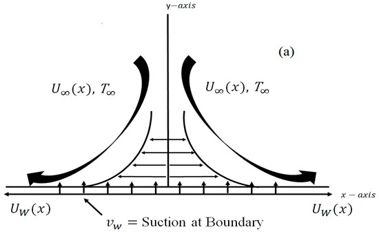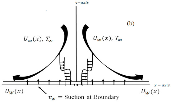 Schematic diagram of the flow channel (a) stretching sheet and (b) shrinking sheet [46].