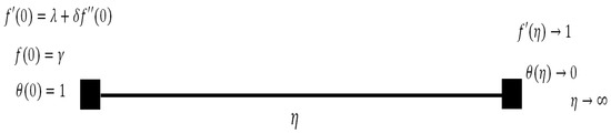 Figure 1, provided above, is a two-dimensional sketch. The governing equations for this model are outlined in Equations (1)–(5). By applying the similarity approach, these governing PDEs (Equations (1)–(5)) were transformed into ODEs, as given in Equations (6)–(10). This transformation reduced the problem from a two-dimensional to a one-dimensional one. To implement the model depicted in Figure 1 using COMSOL, it was necessary to create a line or interval and specify the boundary conditions, which are detailed in Figure 2. For the successful implementation of this one-dimensional problem, it was crucial to utilize the COMSOL interface under ‘Coefficient Form ODEs’.