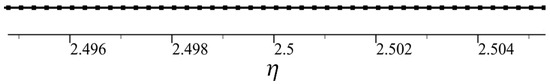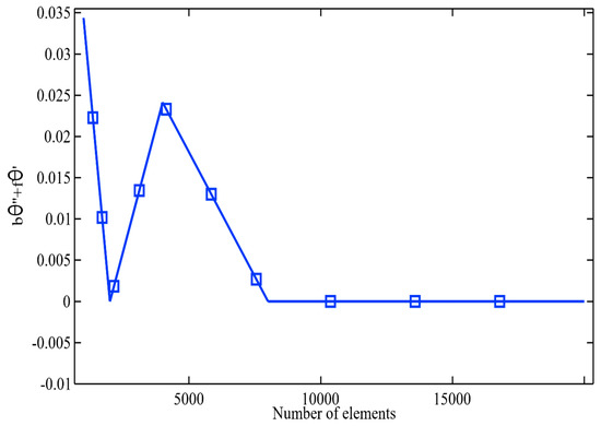 To ensure accuracy in computational schemes, a mesh independence study is essential, see mesh structure in Figure 3. An excellent mesh independence study was conducted and explained in [49]. Motivated by this study, a mesh independence study will be performed for the present numerical computational scheme to achieve optimized accuracy. In Figure 4, an attempt was made to demonstrate the mesh independence procedure by computing Equation (8). Approximately 1000 to 20,000 elements were used to obtain solutions and satisfy this equation. It is noted in Figure 4 that as we escalated the number of elements, the solution improved. After using around 8000 elements, one can see that the error did not propagate significantly. Additionally, the estimations on the vertical axis in Figure 4 could be easily ignored. However, a highly accurate result with minimal error for practical use is desired when it comes to the degree of belief in the solution to a problem. A numerical solution for the nanofluid phenomenon was obtained using 20,000 elements. Displaying these elements in a single line could have been challenging, so a zoomed-in figure was created to show the structure of the 20,000 elements along the line vs. .
