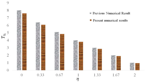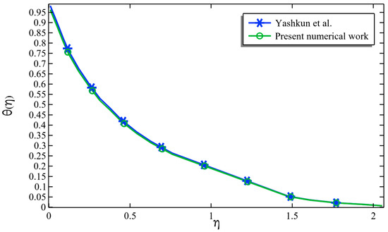 In Figure 5, a comparison is provided between our numerical results with those of Yashkun et al. [46]. Here, one can see that the current numerical code, which was based on previous work using a numerical method, closely resembled their results. Figure 5 shows the conduction for validation by putting up some special cases. One can observe that the assumed HNF was a mono-nanofluid by setting the volume fraction of alumina to zero. The results, obtained using a numerical scheme called the finite element method, validated the previous numerical results. This means that we could proceed with the current problem and discuss the results for post-processing.