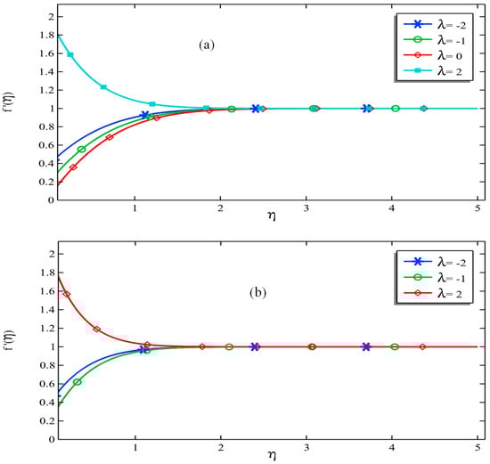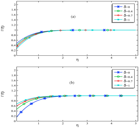 In Figure 6a, one can see that when the estimation of was negative, the velocity profile was at a minimum at = 0. As the estimation of escalated, the velocity of the transport material also escalated. This means that in the shrinking case, the velocity profile escalated. One can also observe that even for the = 0 case, increasing the estimation of led to an escalation in the velocity profile. Similarly, in the = 2 case in Figure 6a, one can see that as the estimation of escalated, the velocity profile decayed. This indicates that in the stretching case, the velocity of the material decayed. In Figure 6b, graphs were developed for the same cases but with = 1. Here, one can observe that the minimum and maximum estimations at = 0 slightly decayed. In the shrinking case, it was noted that when the estimation of was less than −2, the velocity profile decayed. Similarly, it is evident that when there was an escalation in , which is a suction parameter, the velocity profile decayed in both the stretching and shrinking cases.