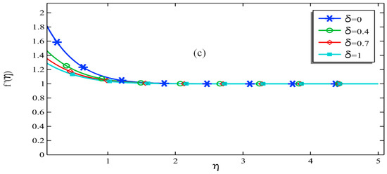In Figure 7c, one can see that we fixed the estimation of as 2, indicating a stretching sheet. Here, it was noted that as the slip parameter escalated, the velocity decayed at = 0 in the stretching case. It is quite clear in this stretching case that the velocity profile decayed as the estimation of escalated. From this discussion, it became evident that the pattern of the slip flow parameter was different for the stretching and shrinking cases. Even when the sheet was stationary, i.e., = 0, increasing the slip flow parameter led to an escalation in the velocity profile at = 0.