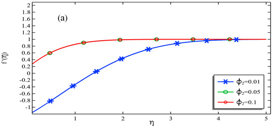 In Figure 8b, where was set to 0, representing a stationary sheet, it was also clear that the velocity outline escalated at = 0, when the volume fraction was increased. In Figure 8a,b, one can observe the cases where the volume fraction was 0.01. In Figure 8a, the velocity escalated but at a decreasing rate, while in Figure 8b, the velocity field escalated at an increasing rate.