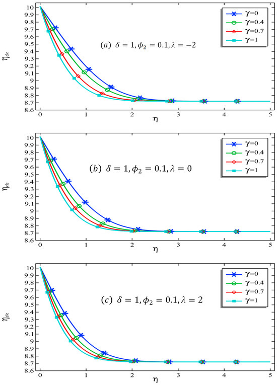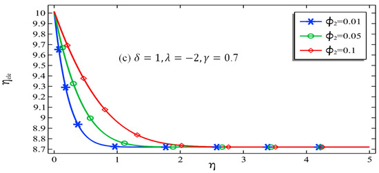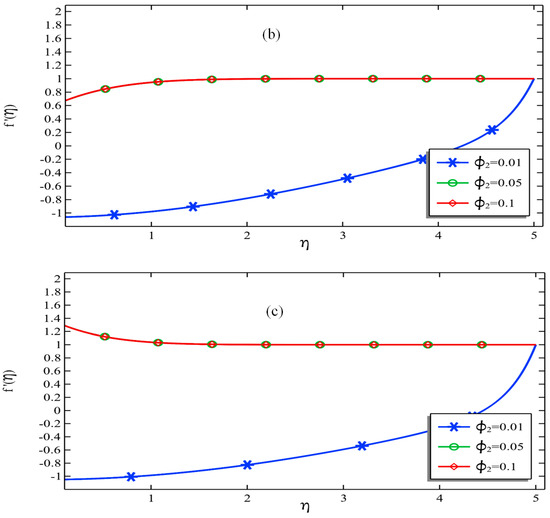 In Figure 7a–c, we also wanted to observe the pattern of the velocity profile of HNFs using the slip flow parameter . For this purpose, we fixed the volume fraction of copper at 0.1 and set as 0, which represents the suction parameter. In Figure 7a, it was noted that when the estimation of was −2, as the slip flow parameter escalated from 0 to 1, the velocity profile at = 0 decayed. From observing all the subgraphs in Figure 7a, one can see that increasing the estimations of also escalated the velocity profile.
