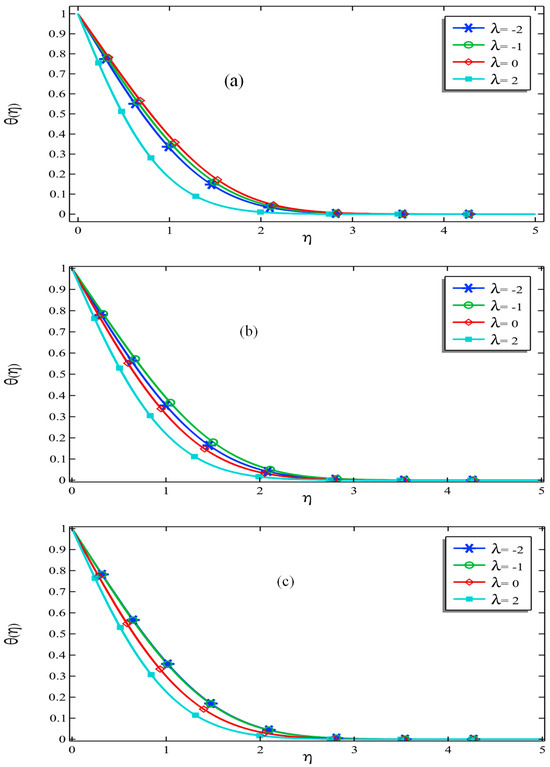 In Figure 9c, where the slip flow parameter δ was set to 1, and λ estimations ranged from −2 to 2, the temperature outline showed the fastest decay. Additionally, for the stretching case, the temperature decrement was the fastest among all cases, regardless of the estimation of the slip flow parameter.
