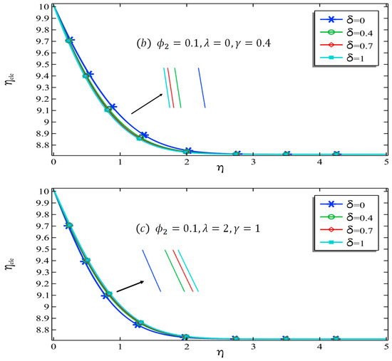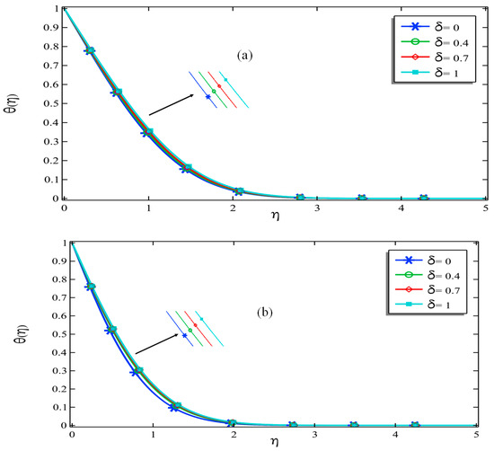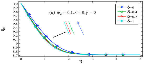 In Figure 10a, where is −2, it was noted that increasing the slip flow parameter resulted in a significant temperature decrement. This means that the temperature decayed rapidly as the estimation escalated from 0 to 1. Now let us examine Figure 10b, where was 2 and represented the stretching case. It was also evident here that increasing the slip flow parameter led to a rapid decline in temperature. This indicates that maintaining a high slip condition is essential for developing a cooling process.