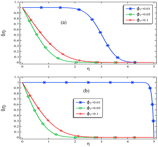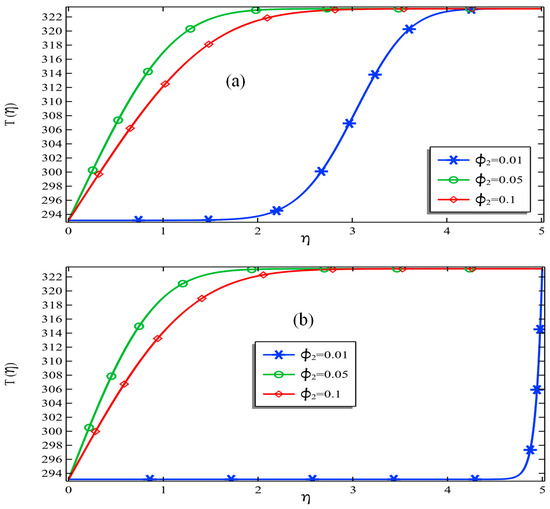 In Figure 10a,b, we observed the pattern of the temperature outline, where we set = 0 and the volume fraction of copper to 0.1. We fixed the estimation of for each graph. It was noted in both Figure 10a,b that for almost every graph, the temperature outline decayed as the estimations escalated.