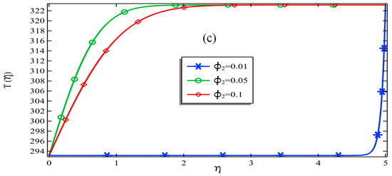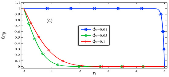 In Figure 8a–c, we created graphs to observe the velocity profiles of the HNFs, and this time, we wanted to escalate the volume fraction of copper. We fixed = 1 and = 0 (no suction), and then from Figure 8a–c, we escalated the estimation of to check its effect.