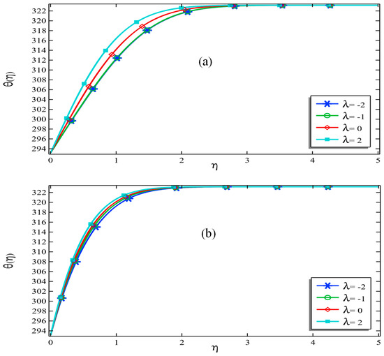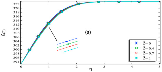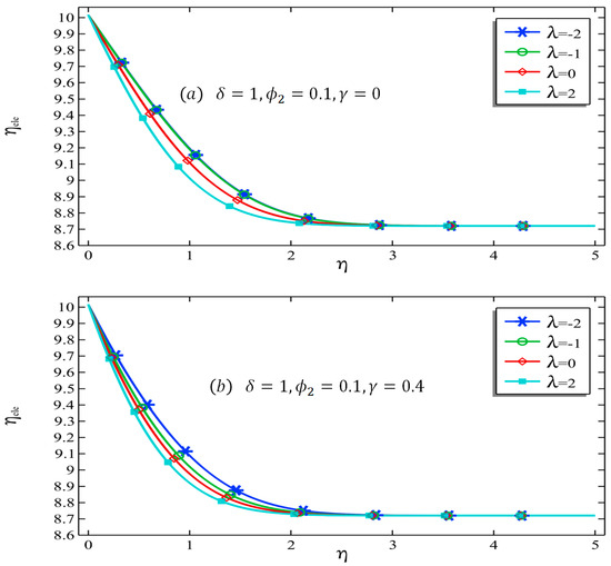 In Figure 9a, it was noted that regardless of the estimations, the temperature outline decayed as the estimations escalated, and the temperature outline was maximum at = 0. In Figure 6a, it was noted that when = 2, the temperature decrement occurred rapidly. Furthermore, in Figure 9a, it was noted that when = 0, the temperature decrement was much slower. In Figure 9a, it was noted that when = −2, the temperature decrement was faster than in the case of = 2. Here, = 0 indicated a no-suction condition.