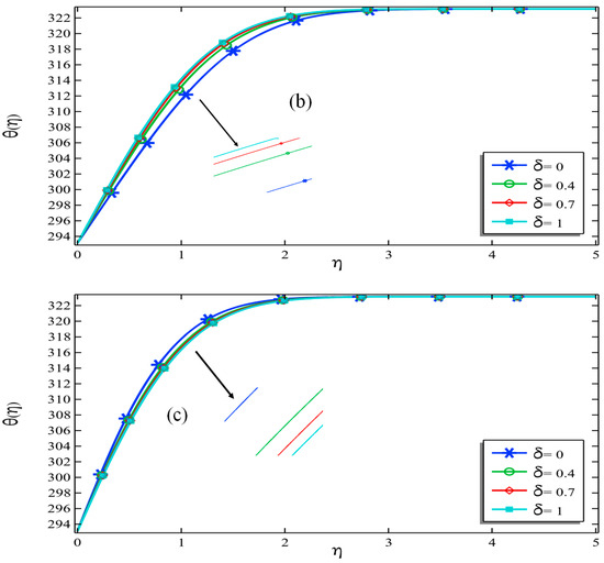 This section will discuss the temperature outline and analyze its pattern by observing it through various parameters. We produced Figure 9a–c, in which we wanted to observe the temperature outline () and examine the pattern as we varied the estimations. In these graphs, we set = 0 and = 0.1, while in Figure 9a–c, we varied the estimations of .
