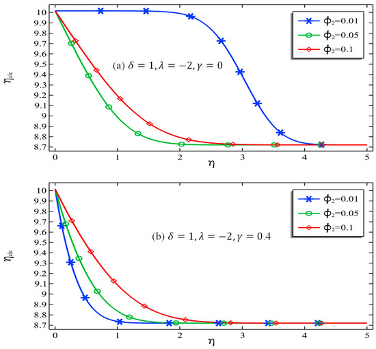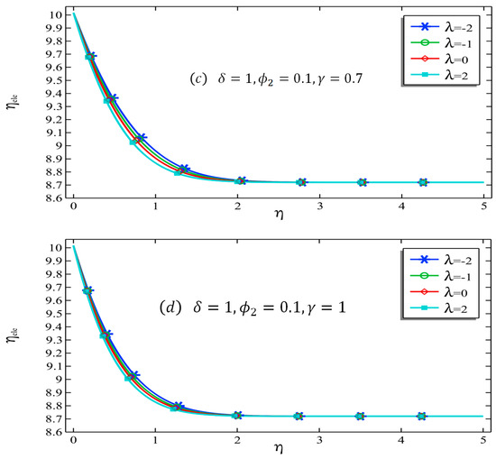 Looking at Figure 8a, where is −2, one can observe a shrinking sheet. In these graphs, it was noted that as the volume fraction of copper escalated, the velocity profile at = 0 also escalated. Overall, increasing the estimation of also escalated the velocity profile for each fixed estimation of the volume fraction of the hybrid mixture. It was noted that when the volume fraction was 0.05 or 0.1, there was a nearly negligible difference in the velocity profile, while keeping the volume fraction at 0.01 showed a significant difference with a notable decay in the velocity profile.