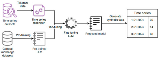 A model for generating synthetic time series data is proposed. The model starts from the development of pre-trained LLMs, which are a specific type of transformer trained on large amounts of data. An LLM learns to predict the next word given the input sequence of words and the context of these words, which makes it a good choice for SDG. There are multiple steps needed for creating the model, as seen in Figure 1.