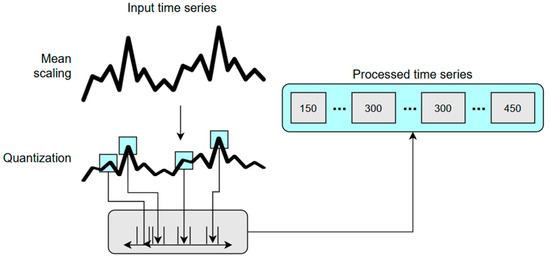 Dividing the input text into smaller units is an important task in training LLMs. Depending on the technique, tokens can consist of a wide range of segments, including characters, words, sub-words, or symbols. The tokenizers usually struggle in multiple cases, such as case sensitivity, trailing whitespace, digit chunking, integers, floating-point numbers, arithmetic reasoning, and model-specific behavior. To be used in fine-tuning the LLM as input, the time series sequence is converted into a sequence of tokens, as shown in Figure 3, using scaling and quantization [37]. This allows the model to handle numerical data as a language model would handle text. The first step is applying mean scaling [38] to the time series to normalize the data. Considering a time series as , where the C time steps are the historical context and H steps are the forecast horizon, the scaling formula is defined in Equation (1), where the scale is . This step ensures that the values are on a similar scale, which is important for the model to process them effectively. The second step is to quantize the scaled values to a fixed number of discrete tokens. This reduces the granularity of the data by mapping the original values to a smaller set of representative values or levels, as defined in Equation (2). Considering bin centers and edges , , where , the quantization function is and the dequantization function is . There are multiple ways of determining the number of bins B [39], for example, quantile binning, which is data-dependent, and uniform binning. In the proposed model, uniform binning is chosen. It uniformly selects the bin centers within an interval . The number of bins chosen for the experimental studies is B = 4094, and this can be changed depending on the input dataset and its frequency to capture the cycles.