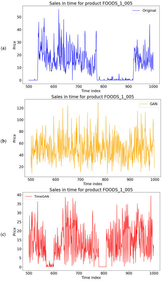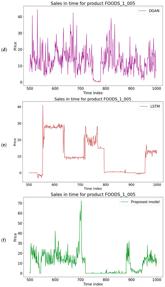 The original synthetic data were compared to the generated synthetic datasets both visually and using similarity metrics. Figure 6 contains the visualization of the time series on the M5 dataset. The proposed model has a higher similarity with the original dataset than the other models. While this is not ideal in every scenario for a general SDG, it has advantages in the cases of data extension and reconstruction. In extending the time series for the same products, it is important to maintain the trend in the time series and avoid being too general; otherwise, important information could be lost. This is important in business use cases for forecasting, where a similar trend is better than an average prediction, where the overall forecasting accuracy is higher.