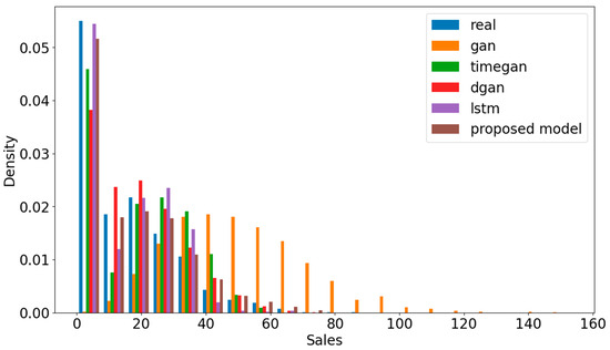The distributions of output values for all the models are compared in Figure 7. The values should be close to the real dataset for a good synthetic dataset that follows the same patterns as the real data. The closer the values are to the real dataset, the more accurate the synthetic data are in terms of fidelity. Analyzing the density for the sales of each model, the proposed model shows results that are closest to the real values compared with the others.