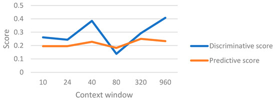An experiment was conducted to determine the best value for the context window in the model. The discriminative and predictive scores by changing the context window size are shown in Figure 8 for the proposed model. It shows how the variation of the context size affects the results. The best value selected for context size was 80.