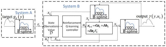 To address these barriers, this paper employs Wang’s B-spline framework to develop a model-free control approach that enables dynamic weights to adapt to a time-varying target pattern. In our design, we utilize Q-learning-based Linear Quadratic Tracking Control (LQT) as a controller to achieve the tracking goal. Traditional LQT often struggle with the complexities of real-world systems, highlighting the necessity for model-free control strategies. Thus, reinforcement learning, particularly strategy iteration, is employed here to handle control and scheduling tasks without requiring complete model information []. As a model-free technique, reinforcement learning optimizes control by learning under given constraints [,]. The concept of L-Extra-Sampled (Les)-dynamics was introduced in [], providing a new perspective for addressing reinforcement learning problems in partially observable linear Gaussian systems. However, the research in this paper primarily focuses on linear Gaussian systems, which may limit the method’s applicability to non-Gaussian systems. In [], an algorithm based on Q-learning was proposed to handle time-varying linear discrete-time systems with complete dynamic uncertainties. Although the algorithm is model-independent, it may require more computational resources to compute the Q-function and update the policy when dealing with high-dimensional systems. Ref. [] introduced extreme value theory into reinforcement learning, proposing a new online and offline maximum entropy reinforcement learning update rule []. This rule avoids the difficulty of estimating the maximum Q-value in continuous action space. In [], an efficient offline Q-learning method was proposed to solve the data-driven discrete-time linear quadratic regulator problem. This approach does not require knowledge of the system dynamic model and demonstrates advantages over existing methods in simulations. In [], a Q-learning based iterative learning control (ILC) framework for fault estimation (FE) and fault-tolerant control (FTC) was proposed to address the actuator fault problem in multiple-input multiple-output (MIMO) systems. However, traditional reinforcement learning methods are inefficient, consuming significant time and requiring continuous adjustment. The efficiency of reinforcement learning can be enhanced by integrating it with optimal control techniques. For instance, in [], the successful application of Q-learning to handle discrete systems with uncertain parameters was demonstrated, improving tracking control performance. Similarly, Xue’s extension to two-time-scale systems showed favorable outcomes []. However, these findings are based on deterministic models and neglect the system randomness and uncertainties. By solving the Riccati equation for quadratic optimal control of linear stochastic systems with unknown parameters, we improve learning efficiency and achieve model-free tracking control. This approach allows for effective control even in the presence of random disturbances, addressing the limitations of traditional methods and enhancing the practical applicability of our framework.