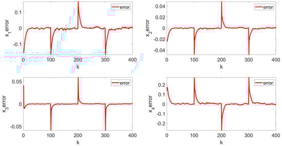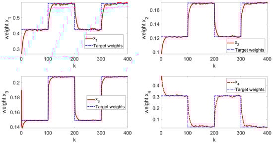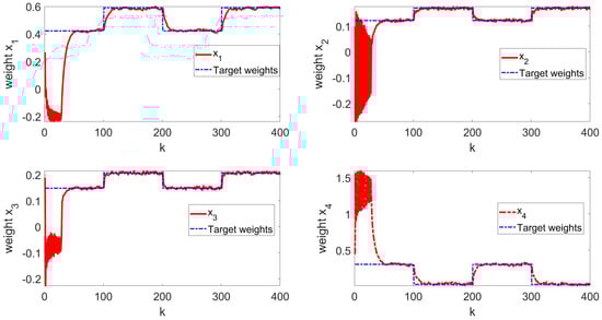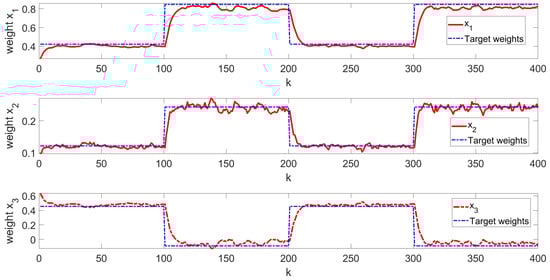 In the described model, represents the state weight matrix, is the control matrix, is the random weight matrix of the noise term, and is the Gaussian noise. Note that the parameters , , and are assumed unknown. The target weights change every 100 steps, alternating between and . Additionally, the initial state of the system is set at . The noise covariance follows the distribution given by . The performance index, as indicated in Equation (14), employs and , with a discount factor . The parameter is chosen to be a suitably small value . The initial kernal matrix is given by: