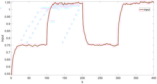The simulation results are shown in Figure 3, Figure 4, Figure 5, Figure 6 and Figure 7. Figure 3 illustrates the weight tracking effect during the online learning process. It is evident that the algorithm begins with exploration and converges around the 40th iteration, demonstrating its computational efficiency. Notably, in Figure 4, the red line represents the weight tracking curve under the enhanced Q-learning algorithm, while the blue dashed line represents the target reference curve. The weights , , and are controlled states, whereas , which is linearly related to the other weights and excluded from control due to constraints, is also shown. Figure 4 further shows the control of the four weights and their corresponding target reference curves after the learning is completed. This demonstrates that the reinforcement Q-learning algorithm successfully tracks the specified target weights after learning. Figure 5 presents the system control input, with the red line indicating the control input curve under the reinforcement Q-learning algorithm. This curve aligns synchronically with the target configuration change and is smooth enough for practical use. Figure 6 illustrates the output curve of the reinforcement Q-learning algorithm, which consistently follows the desired PDF shape at each time instant. It also presents the results of the target weights integrated with the PDF output derived from the B-spline model. For example, in controlling the flame shape, this curve represents the flame shape at each moment. Despite the unknown system parameters, the output curve achieves the desired PDF shape, highlighting the effective utilization of the data. Figure 7 shows the tracking error curve of the four states. It can be seen from the figure that, despite the presence of multiplicative noise interference, the tracking effect remains very good. The tracking error only experiences a jump when the tracking weight changes, and in the remaining cases, it is essentially near 0. Finally, the mean square error of the tracking is calculated to be very small, specifically 0.0285, indicating that the tracking effect is good. These results indicate that the proposed control framework effectively enables the system’s PDF to track a predefined PDF shape without requiring specific knowledge of the system parameters.