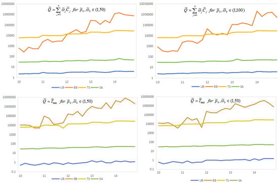 From Table 2 and Table 3, for , the CPU time grows with the increase in n, and the UB and SA algorithms are substantially shorter than the B&B and TS algorithms. Specifically, for job numbers 10–11, the TS algorithm exhibits a longer CPU time compared to the B&B algorithm, whereas for job numbers ranging from 12 to 14, the TS algorithm outperforms the B&B algorithm in terms of CPU time. Additionally, the UB, TS, and SA algorithms perform very well in terms of the error (all 0%). Based on these observations, it can be inferred that, when the value range of , the algorithms (UB, TS, and SA) perform remarkably well.