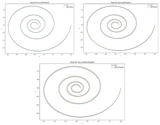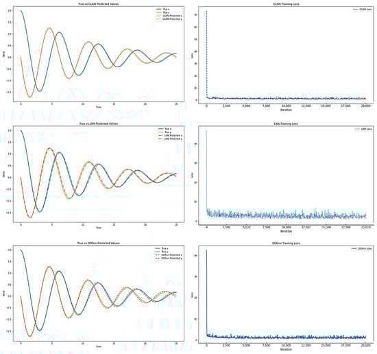The initial value problem was processed for each test sample throughout the training phase using the Generalized LNN framework. In this research, we evaluated the performance of different neural network models for predicting damped sinusoidal signals, focusing on a comparative analysis between three distinct methodologies: a Neural ODE model, a conventional LNN, and a proposed Generalized Liquid Neural Network. The graphical illustration in Figure 3 presents itself by plotting the true trajectory with the predicted trajectory in the phase plane for each model case. A comparison of all these models’ abilities for trajectory prediction and training loss is given in Figure 4. Figure 3 illustrates how the training for f, the orange trajectory, fits with true value. This experimental procedure demonstrated a consistent decrease in loss, indicating an enhancement in learning accuracy. Our experimental setup consists of a neural network model that predicts the system’s evolution. This model comprises a single hidden layer with 50 neurons and uses the hyperbolic tangent activation function. The network outputs are two-dimensional, corresponding to our study’s dynamical system. Weights and biases are initialized with a normal distribution (mean = 0 and standard deviation = 0.1) and zero, respectively, to promote convergence. The dataset involves 1000 data points sampled from the system’s trajectory, with training conducted in mini batches of 20 samples, each consisting of sequences of 10 time points. The training process is repeated over 20,000 iterations with a learning rate of 0.001 using the RMSprop optimization algorithm. Loss is calculated as the norm of the difference between predicted and actual trajectories, and this metric is recorded periodically every 20 iterations to monitor training progress.