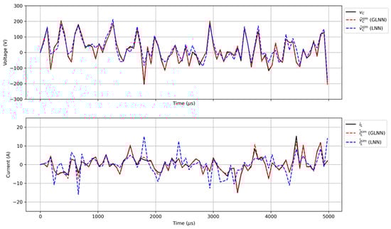 This relationship reflects the characteristics typical of ferrite inductors operating in partial saturation. For this study, the GLNN framework is tasked with estimating the system’s state variables, and , which are observed under noisy conditions. The training dataset, denoted as with () samples, is constructed by simulating the system over a 2 ms duration with a fixed timestep . The input for this dataset is a filtered white noise signal with a bandwidth of 150 kHz and a standard deviation of 80 V. This setup provides a realistic noise environment where the observations of and are corrupted by additive white Gaussian noise with zero mean and standard deviations of 10 V and 1 A, respectively, corresponding to signal-to-noise ratios (SNR) of 20 dB and 13 dB.