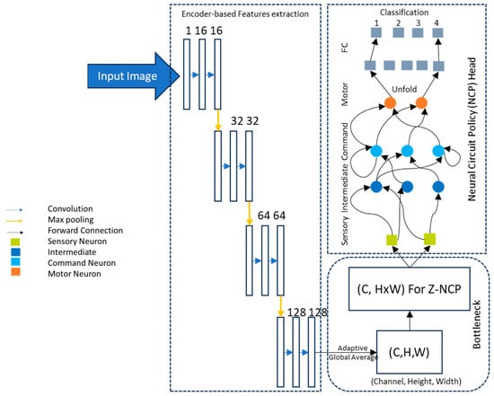 These sequences are then processed through the generalized framework of LNN, enhanced by the NCP head. The NCP head is configured similarly to the neural structure of the C. elegans nematode, including sensory, interneuron, command, and motor layers. This multi-layered approach ensures that each sequence is thoroughly analysed, decisions are made intelligently, and accurate classifications are executed. Post-processing, the data passes through a fully connected (FC) layer, which transforms the sequence of predictions into a single probability score per class, ensuring precise disease classification. This innovative method improves the efficiency and accuracy of feature extraction and utilizes the unique capabilities of the NCP network to enhance diagnostic performance while minimizing computational resources. The block diagram in Figure 8 consists of three main blocks: encoder-based feature extraction, bottleneck, and NCP head. The first block extracts the features using an encoder, and the second block sequentializes the data using the adaptive global average and Z-NCP. The third block comprises the NCP head and FC layer for disease classification.