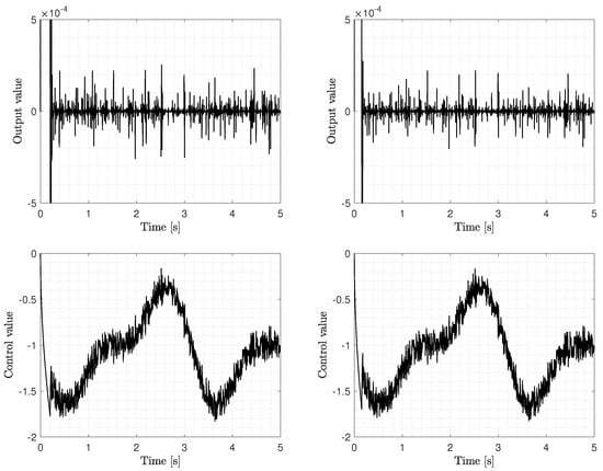 This shows that the Mittag–Leffler sliding mode control provides better regulation with less control energy, thus improving the closed-loop performance. It can be mentioned that considering kernels with lower values of , the accuracy of the regulation task improves significantly. However, for real-world applications, the order should be kept as high as possible to improve the regularity of the control signal, such that the controller implementation is closer to the theoretical framework, even under the action of moderately fast actuators and conservative computational resources.