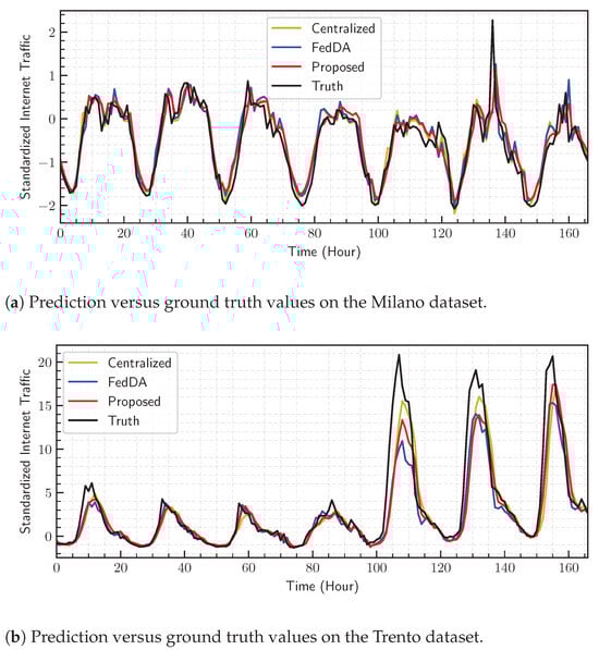 To evaluate the accuracy of the prediction model, we used the mean absolute error (MAE) [26], mean squared error (MSE) [27], and R2 score as evaluation metrics. These metrics are commonly used to assess the accuracy of prediction models in various fields, including machine learning, data analysis, and statistics. The MAE measures the average magnitude of the errors in a set of predictions, while the MSE measures the average squared differences between predicted and actual values. These metrics help quantify the prediction model’s accuracy and provide a basis for comparison with other models. Overall, the use of CDRs from Milan and Trentito as the primary datasets, along with the evaluation metrics of MAE and MSE, allowed us to conduct a rigorous and comprehensive analysis of their prediction model’s performance. We also compared the communication cost (Comm.) among different algorithms. The lower the communication cost, the better the performance.