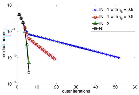 An example is presented to illustrate the numerical behavior of NI, INI_1, and INI_2 for monotone matrices. The minimal residual method is used to solve the inner linear systems, with implementations using the standard Matlab function minres. The outer iteration begins with the normalized vector of , and the stopping criterion for outer iterations is defined as follows: