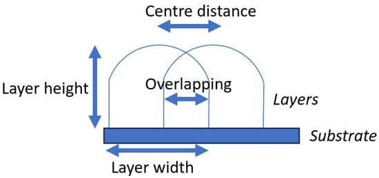 Nowadays, the abundance of resources dedicated to the development of AI applications has facilitated its widespread integration across various industrial applications, including modeling [6,7,8,9], control [10,11,12], optimization [13,14,15], and especially monitoring [16,17,18,19,20,21,22,23]. AI has emerged as a prominent tool, particularly in the modeling and monitoring tasks, with supervised learning approaches predominantly favored due to their demonstrated effectiveness and reliability in achieving desired outcomes [24,25,26,27,28]. These approaches leverage labeled datasets to train models, enabling them to accurately identify patterns and make informed decisions based on past observations. As previously mentioned, one of the most promising applications in the field of AM is predictive modeling. This approach allows for the generation of models that are valuable for simulating what-if scenarios and other applications, especially considering the intricate thermomechanical nature of metal transformation that would otherwise require complex physical models [29]. Due to the complexity, high resource demands, and time-consuming nature of modeling physical phenomena using methods such as finite element analysis, AI is emerging as an alternative tool. However, given the “black-box” nature of the data-driven methods they employ, AI models face challenges related to the low interpretability of their results compared to traditional “white-box” approaches. One of the most important application of process modeling in WAAM is the slicer software, as the geometry of the deposited layers (output) heavily depends on various input factors such as the employed process parameters, welding technique, wire diameter, and material composition utilized for component fabrication [11,30]. When a CAD geometry is obtained, the input factors can be used to determine key layer geometry parameters such as width, height, and overlapping distance (d) [31], as illustrated in Figure 3. Additionally, if a part has a height of N mm, the obtained layer height (h) can be used to determine the required number of slices and generate the path planning for the deposition of subsequent layers by adjusting the position of the robot. Selection of the correct process parameters, which depend on the model employed to correlate the layer geometry and input factors, is important; an incorrect parameterization, as may result from using an inaccurate model to estimate layer height, can lead to error accumulation during part production, resulting in defects such as spatters, humping, and porosity. In fact, if a layer height of h is estimated and a exists, it can accumulate during the deposition until the distance between the torch and the workpiece is different from the planned one, leading to an unstable printing process [32].